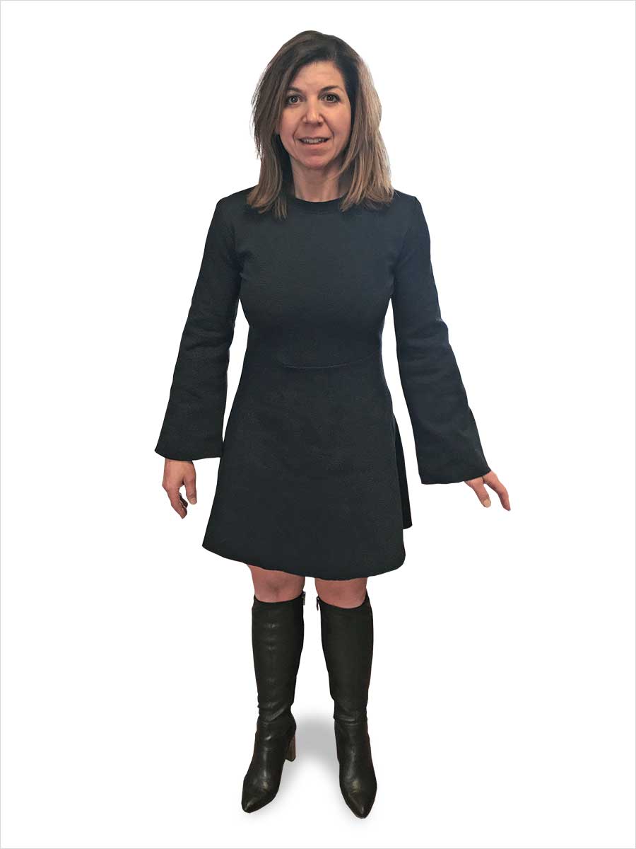 Marci made this cute knit dress using a textured double knit with added stability and weight. Together the raised waistline and shaped skirt create a smooth fitted line. The sleeves were designed with a band in mind but she skipped the band in favor of a bell shaped sleeve. Marci paired it with tall boots, totally in keeping with her fun approach to fashion.