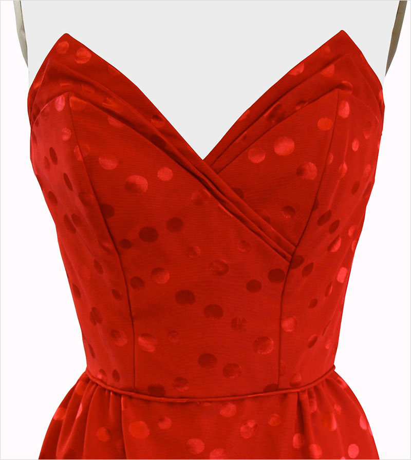 Ready to rock at any party from formal on down, here is a red silk and cotton jacquard faille strapless dress with self fabric bands, boning, self piping at the waist, soft waistline gathers in a mostly straight skirt, and fully lined. It began life as a floor length dress with a high slit, later shortened for yet another wearing. The bodice pattern is Vintage McCall's 8633. Long black gloves, vintage jewels, and outrageous Charles Jourdan shoes (heavily discounted at Filene's Basement!) completed the look.